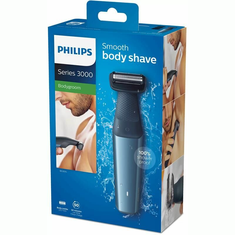 Afeitadora corporal Philips BG3015/15 de la serie Bodygroom 3000 diseñada para recortar y afeitar con suavidad y seguridad en todo el cuerpo. Cuenta con lámina hipoalergénica y puntas redondeadas, 3 peines-guía (3/5/7 mm), 50 minutos de autonomía y uso apto para ducha, ofreciendo control ergonómico y fácil limpieza.