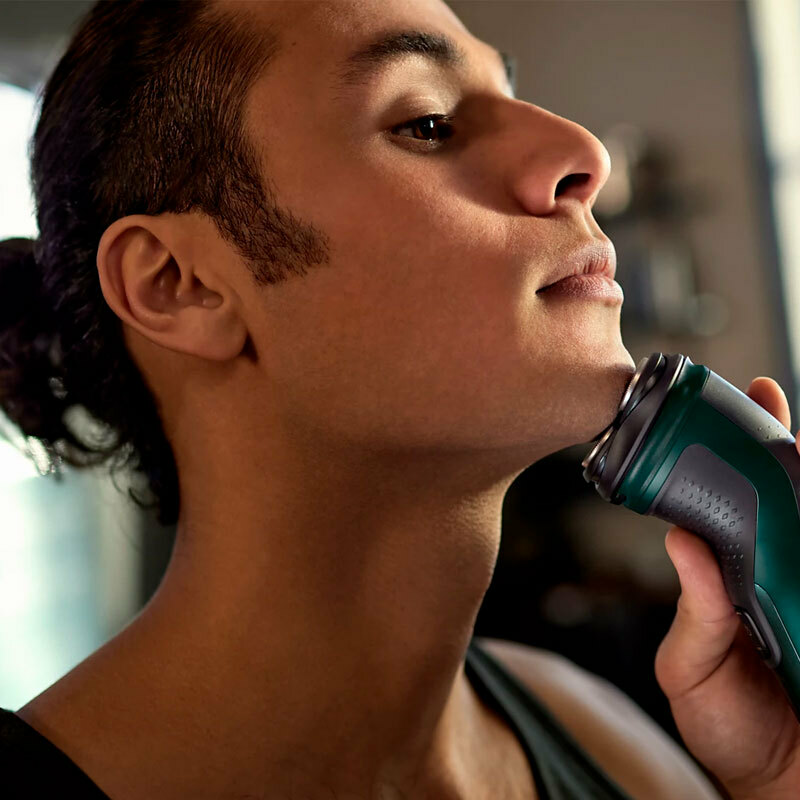 Afeitadora eléctrica Philips Series 3000X diseñada para un afeitado cómodo y apurado con 27 cuchillas PowerCut y cabezales flexibles 4D que siguen el contorno facial. Admite uso en seco y húmedo, es resistente al agua (IPX7) y ofrece 45 minutos de autonomía tras 1 hora de carga. Incorpora cortapatillas desplegable, batería NiMH y diseño ergonómico para un manejo seguro y limpieza sencilla bajo el grifo.
