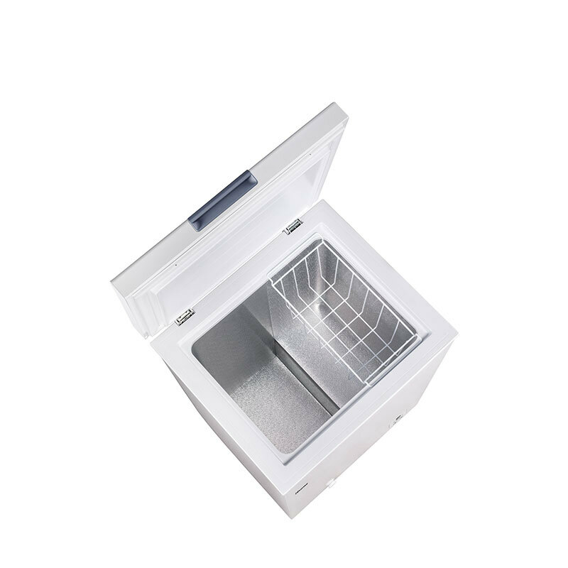Congelador arcón Hisense FT184D4AWYE de 142 L en color blanco diseñado para libre instalación. Cuenta con control táctil de temperatura, función de congelación rápida y modo convertible a frigorífico. Ofrece 135 h de autonomía ante cortes eléctricos, diseño práctico con cesta interior y tirador integrado, y eficiencia energética clase E para un consumo contenido.