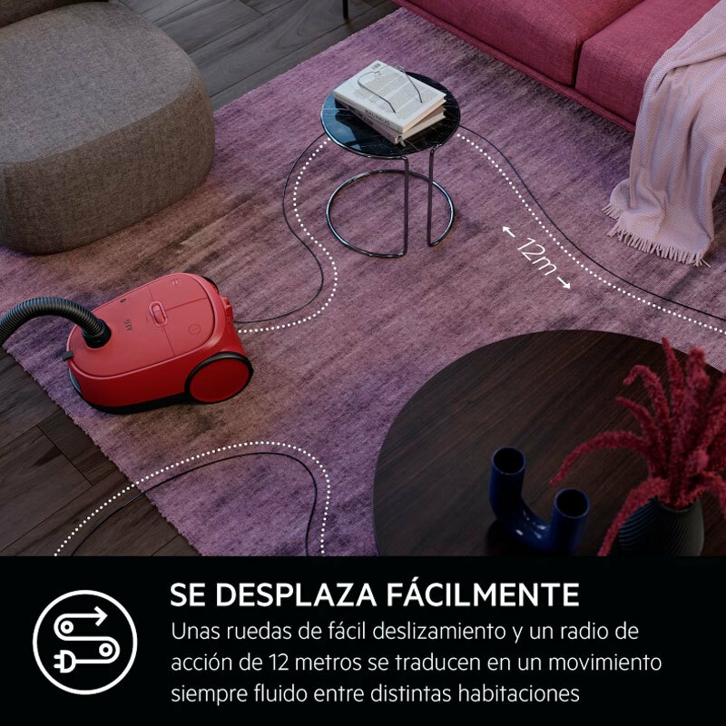 Aspiradora con bolsa AEG AB61C2DB de la Serie 6000 diseñada para limpieza eficaz en suelos duros y alfombras. Motor de hasta 850 W y filtración HEPA E12 con bolsa S-bag de 3,5 L proporcionan potente succión, bajo nivel sonoro de 73 dB y amplio radio de acción de 12 m.