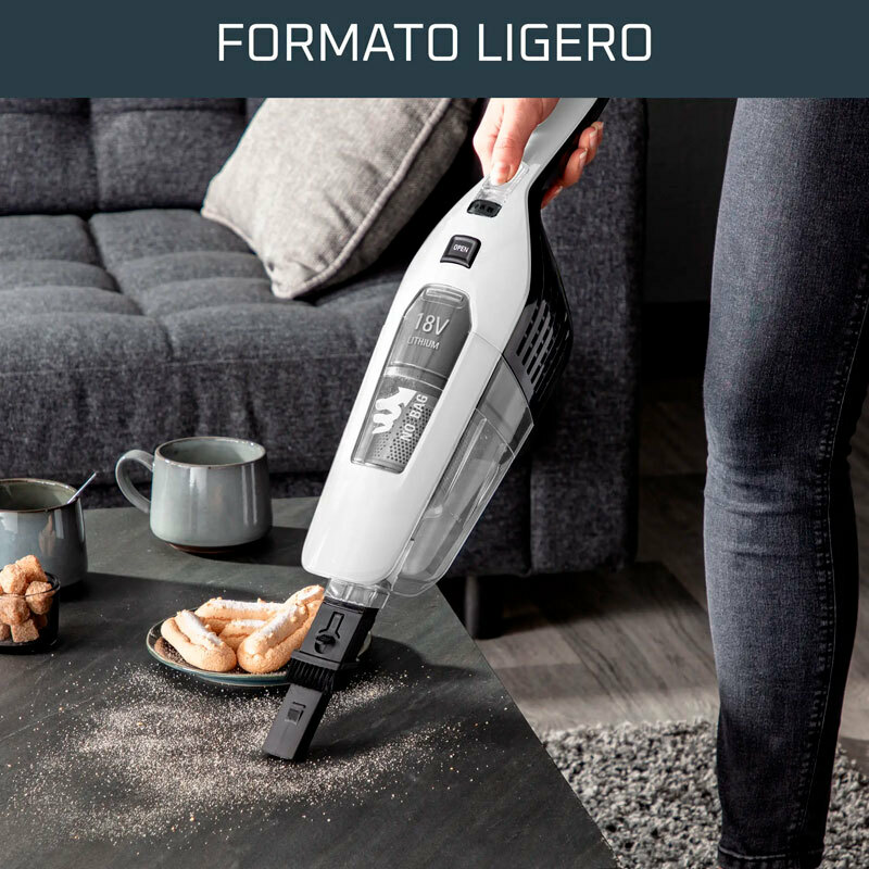 Aspiradora escoba inalámbrica Rowenta RH6737WH diseñada para ofrecer limpieza eficiente y versátil en el hogar. Incorpora sistema ciclónico y filtración de alto rendimiento, depósito de 0,6 L, cepillo motorizado con luces LED, batería de 18 V con hasta 45 min de autonomía y carga en 5,0 h. Su formato ligero y plegable facilita el manejo y el almacenamiento, además incluye accesorios para ranuras y limpieza de tapicerías.