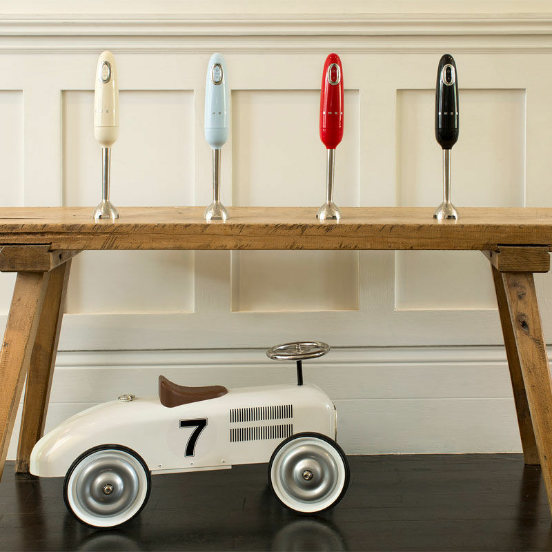 La batidora de mano Smeg HBF01RDEU combina estética retro 50's con un motor de 700 W, control de velocidad variable y función Turbo para obtener resultados rápidos y homogéneos. Dispone de brazo y cuchillas de acero inoxidable con sistema FlowBlend, mango ergonómico antideslizante y diseño compacto para un manejo y limpieza sencillos.
