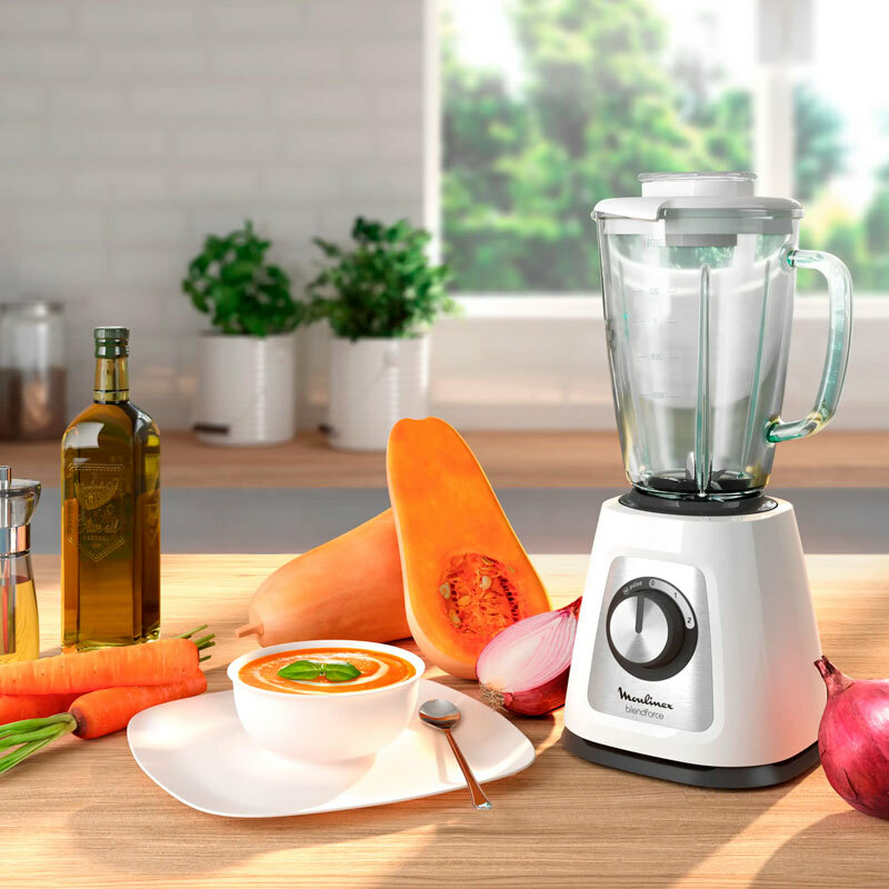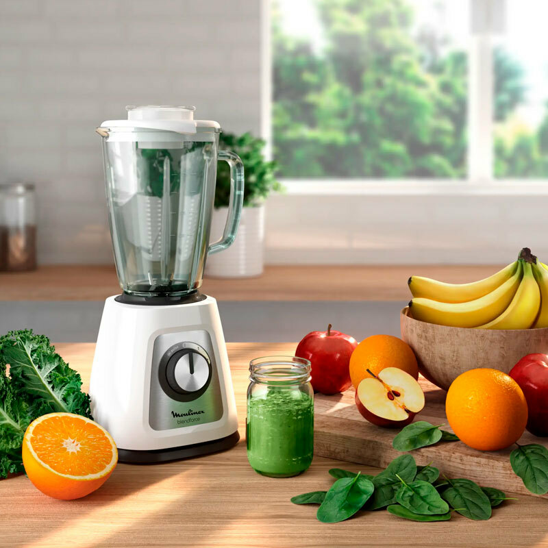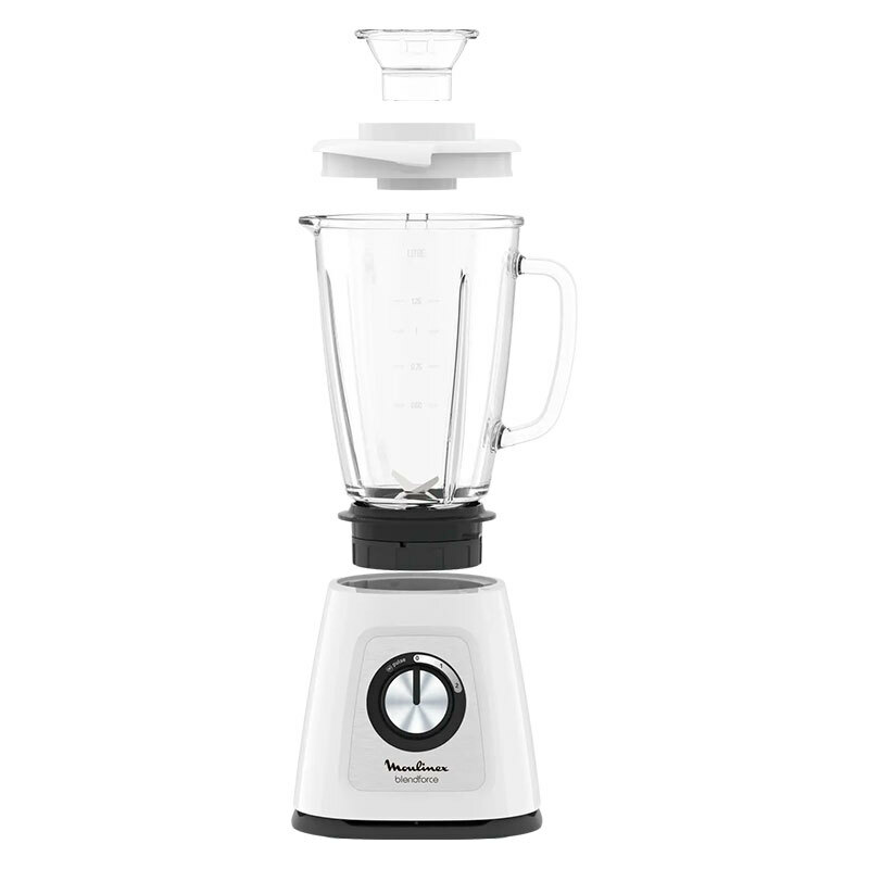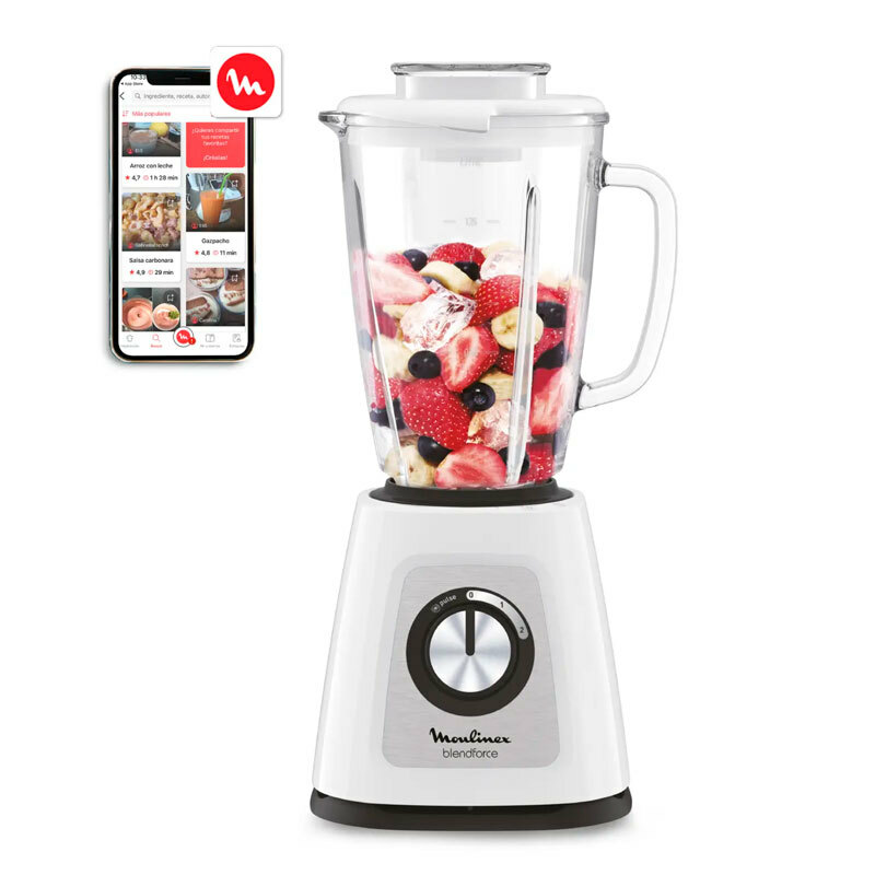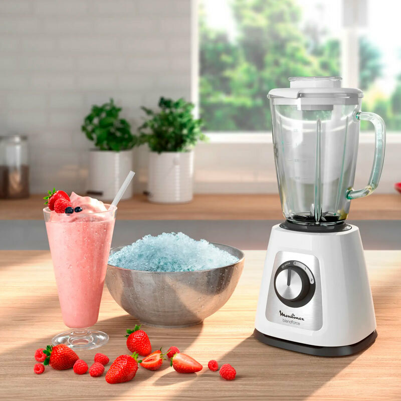 Batidora de vaso Moulinex LM430110 Blendforce de 800 W con jarra de cristal termorresistente de 1,75 L que ofrece 2 velocidades más función Pulse y cuchillas de acero inoxidable para picar hielo. Incorpora sistema Smart Lock, ventosas de base y piezas aptas para lavavajillas, diseñada para uso diario y resultados homogéneos.