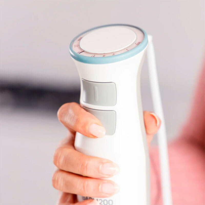 La batidora de mano Taurus Bapi 1200 Pure integra un motor de 1.200 W con regulador de 20 velocidades y función Turbo para obtener texturas homogéneas. Dispone de Turbo Rotation System, varilla y cuchillas de acero inoxidable, vaso medidor de 700 ml y función picahielos. Su diseño ergonómico con agarre soft-touch y accesorios aptos para lavavajillas facilitan el uso y la limpieza.