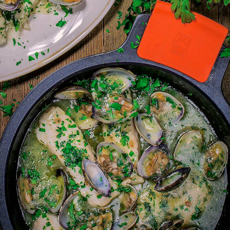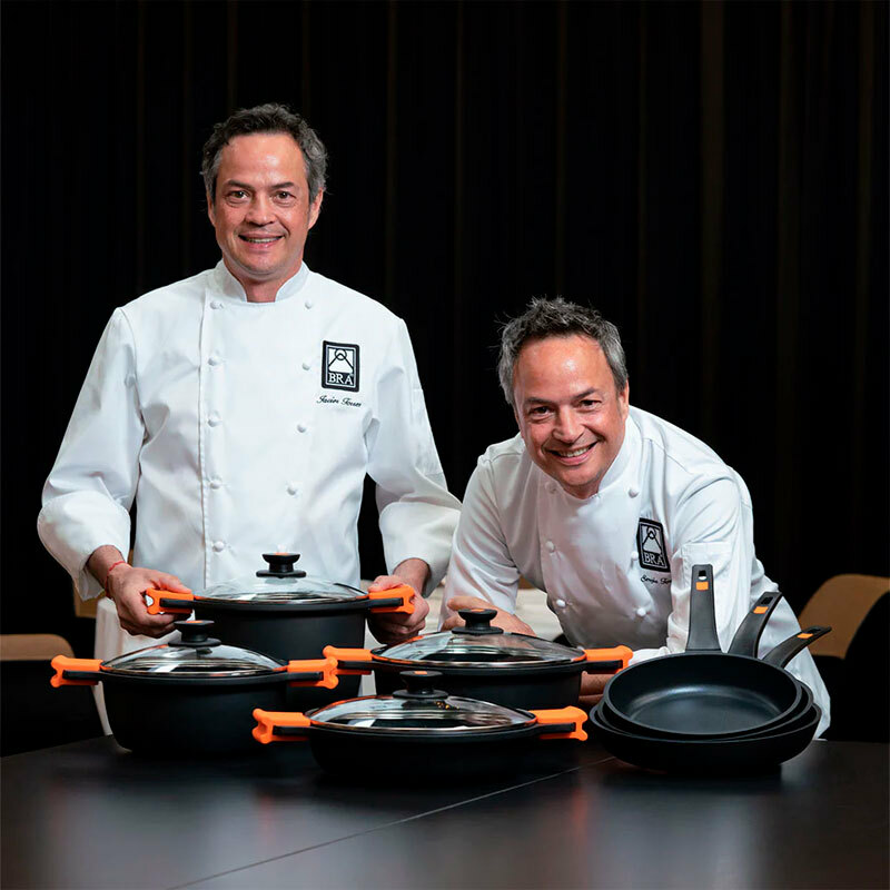Cacerola alta Bra Efficient de 28 cm diseñada para cocinas exigentes que combina cuerpo de aluminio fundido con revestimiento antiadherente Teflon Platinum Plus libre de PFOA. Presenta fondo full induction apto para todas las encimeras, tapa de vidrio con borde de silicona, asas desmontables de silicona y compatibilidad con lavavajillas y horno sin tapa hasta 220 °C.