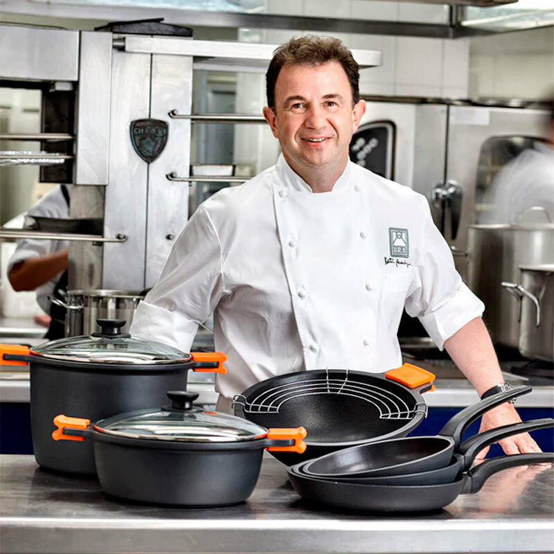 La cacerola alta BRA Efficient A270332 de 32 cm y 8,3 L está fabricada en aluminio fundido con base de 6 mm y recubrimiento antiadherente Teflon Platinum Plus libre de PFOA. Incluye tapa de vidrio y asas de silicona extraíbles, apta para todas las cocinas, lavavajillas y horno hasta 220 °C.