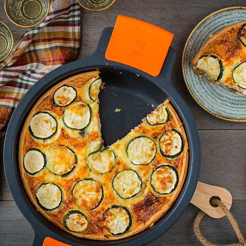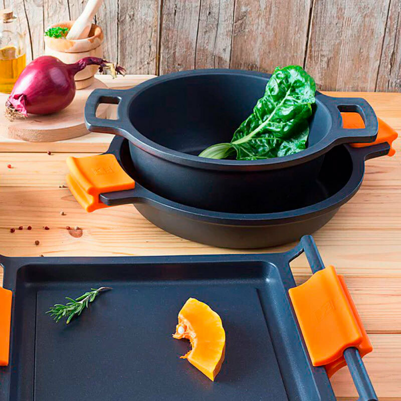 Cacerola baja BRA Efficient de 24 cm sin tapa diseñada para uso diario y cocción intensiva. Construida en aluminio fundido con revestimiento antiadherente Teflon Platinum Plus, ofrece excelente reparto térmico gracias a su fondo full induction. Incluye asas de silicona extraíbles, es apta para todas las cocinas y lavavajillas y resistente al horno hasta 220 °C.