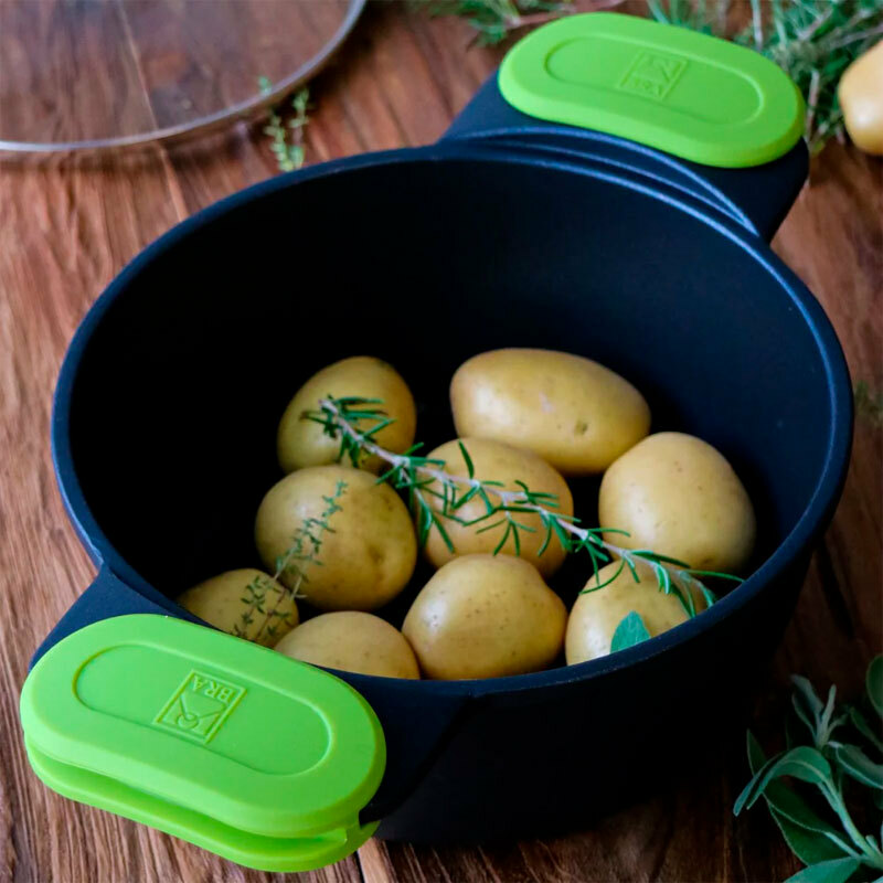 Práctica cacerola alta BRA Foodie A490320 de 20 cm para uso diario. Fabricada en aluminio fundido con base full induction y revestimiento antiadherente tricapa Teflon Innovations libre de PFOA. Incluye tapa de vidrio y asas de silicona extraíbles. Reparte el calor homogéneamente y facilita la limpieza, apta para todas las cocinas y horno hasta 220 °C.
