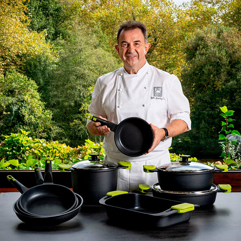 Cacerola alta Foodie de Bra de 24 cm y 4,0 L fabricada en aluminio fundido con base full induction y revestimiento antiadherente tricapa libre de PFOA; incluye tapa de vidrio y asas de silicona extraíbles. Ofrece buena distribución del calor, diseño resistente y es apta para todas las cocinas, lavavajillas y horno hasta 220 °C sin asas.