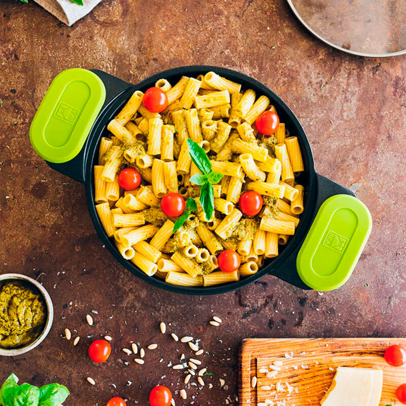 Cacerola de la colección Foodie diseñada para uso diario, fabricada en aluminio fundido con revestimiento antiadherente tricapa libre de PFOA que facilita la cocción y limpieza. Fondo full induction compatible con todas las cocinas, incluye tapa de vidrio y asas de silicona, y el cuerpo es apto para horno hasta 220 °C.