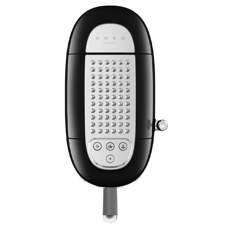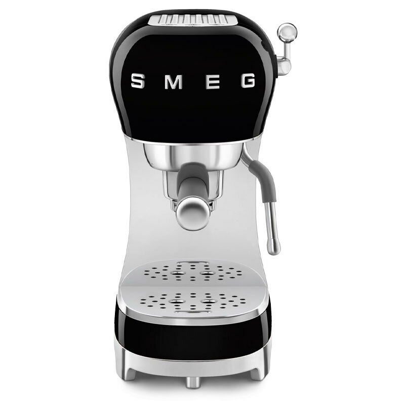 Cafetera espresso manual Smeg ECF02BLEU en acabado negro brillante diseñada y fabricada en Italia. Incorpora sistema Thermoblock, bomba de 15 bares y portafiltro de 51 mm, acepta café molido y monodosis, dispone de varilla de vapor, depósito extraíble de 1,1 L y funciones programables para mayor confort.