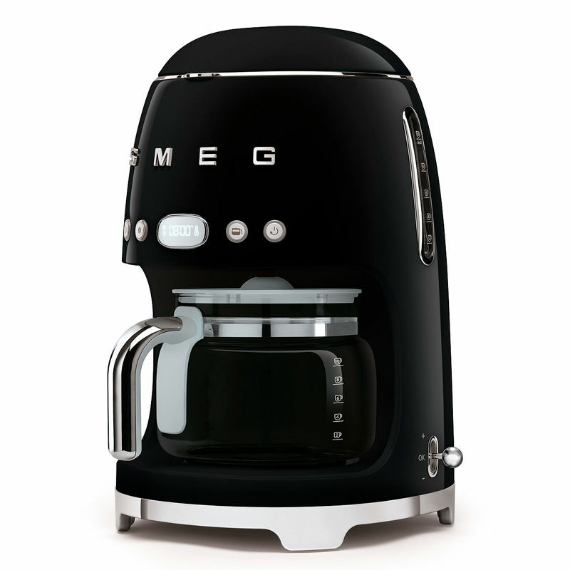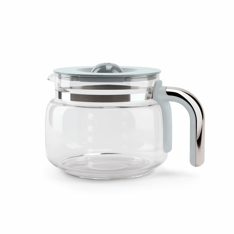 La cafetera de goteo Smeg DCF02BLEU combina estética 50's con prestaciones domésticas. Dispone de depósito de 1,4 L y jarra de vidrio para 10 tazas, selector de intensidad de aroma en 2 niveles, programación AutoStart, función 1-4 tazas y mantenimiento del calor hasta 40 minutos, en cuerpo de acero inoxidable y plástico.