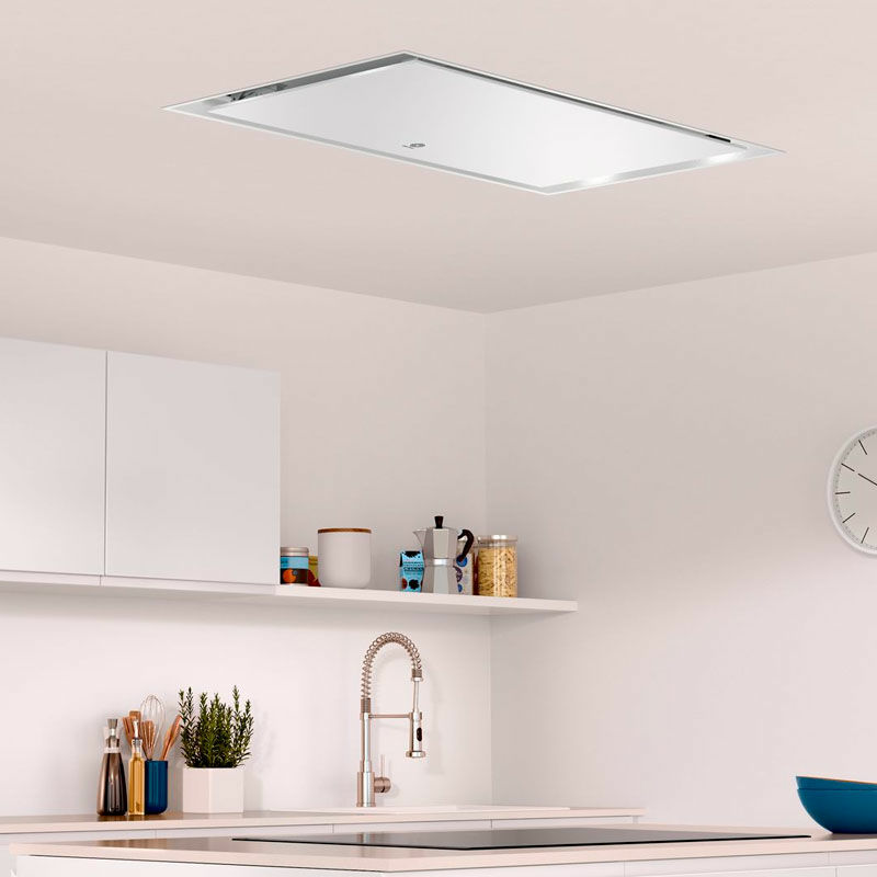 Campana de techo Balay 3BE296HW en acabado blanco, diseñada para empotrar en falso techo y proporcionar extracción eficiente con bajo nivel sonoro. Incluye motor de alta eficiencia con 10 años de garantía, control electrónico con mando a distancia, filtros antigrasa lavables y conectividad Home Connect para manejo remoto.