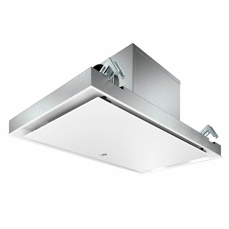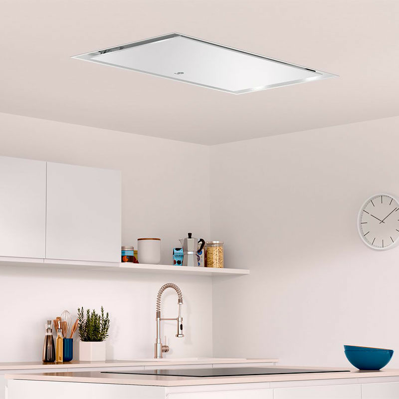 Extractor de techo Balay 3BE297RW en color blanco, 90 cm de ancho, diseñado para instalación en isla o empotrado. Motor de alta eficiencia con 10 años de garantía, mando a distancia, 5 velocidades (3 + 2 intensivas) y potencia máxima de extracción de 798 m³/h. Filtros perimetrales de acero inoxidable lavables y iluminación LED para una operación eficiente y cómoda.