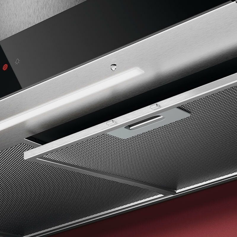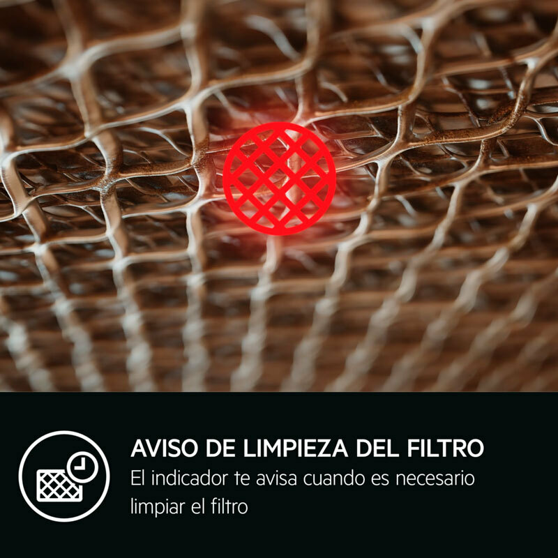 Campana extractora decorativa AEG GB67D91HL de 90 cm en acero inoxidable con panel de cristal negro que combina diseño y alto rendimiento. Dispone de 3 velocidades más modo intensivo (hasta 730 m³/h), tecnología Hob2Hood para sincronizar con la placa, iluminación LED y filtros metálicos lavables. Presenta clasificación energética A, sistema de aviso para limpieza de filtros y funciona en evacuación al exterior o en recirculación para mantener la cocina libre de humos y olores.