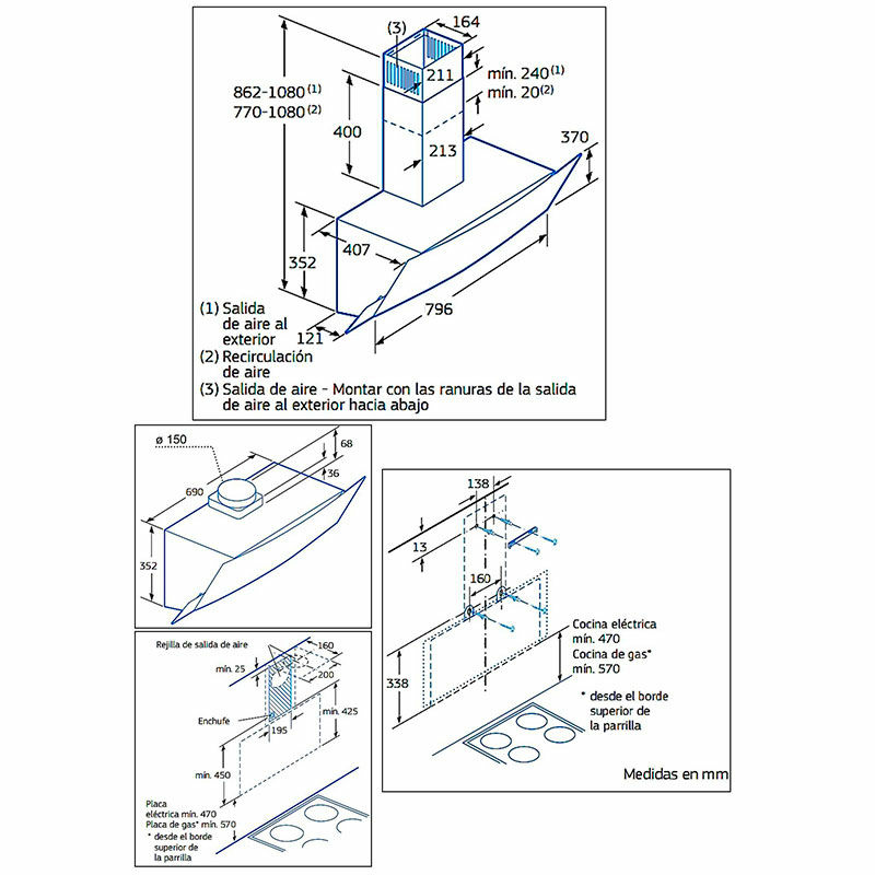 Campana decorativa Balay 3BC585GB en acabado cristal blanco y 80 cm de ancho. Ofrece una capacidad de extracción máxima de 629 m³/h con 3 niveles de potencia y control táctil. Incorpora iluminación LED, filtros de aluminio lavables en lavavajillas y posibilidad de instalación en evacuación o recirculación, que combinan eficiencia y diseño práctico para la cocina.