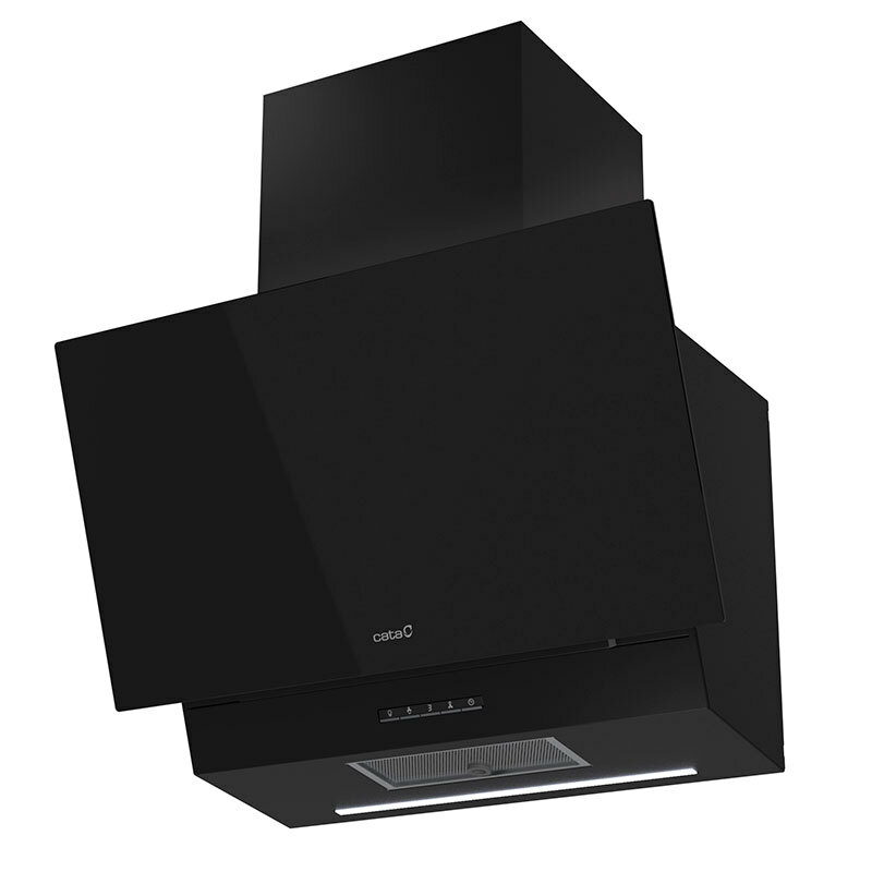 Campana decorativa Cata Thalassa 700 GBK/G en cristal negro de 70 cm diseñada para extracción mixta eficiente y uso doméstico. Incorpora control táctil con display, iluminación LED regulable, 6 niveles de potencia con función turbo, filtro metálico lavable y opción de recirculación, ofreciendo alto rendimiento y fácil mantenimiento.