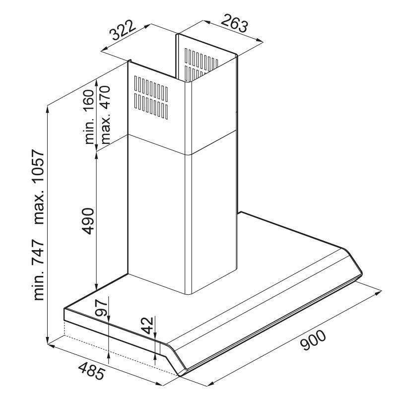 Campana decorativa Fagor 3CFB-900N en acabado negro mate de 90 cm con control táctil y cuatro velocidades más función turbo. Ofrece extracción mixta (evacuación/recirculación) hasta 711 m³/h, iluminación LED eficiente, filtros de aluminio lavables en lavavajillas y chimenea regulable. Clase energética B y diseño T invertida que combina potencia y bajo nivel sonoro para ambientes domésticos.