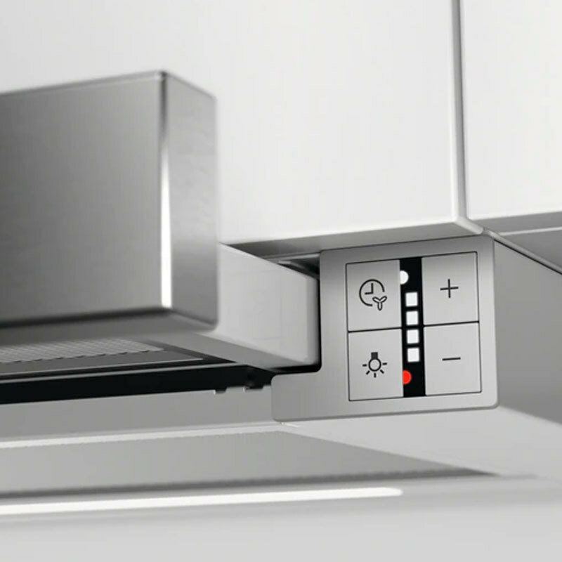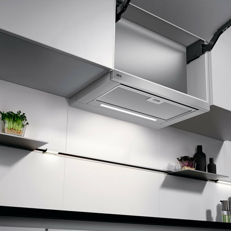 Campana extraíble AEG DPE5660M de 60 cm diseñada para integración bajo mueble que combina potencia y eficiencia energética. Motor de alto rendimiento con extracción máxima de 660 m³/h, tres velocidades más intensiva y luz LED. Filtros de malla de aluminio aptos para lavavajillas e indicador de limpieza. Acero inoxidable antihuellas y control por pulsadores garantizan un uso práctico y una cocina libre de humos y olores.