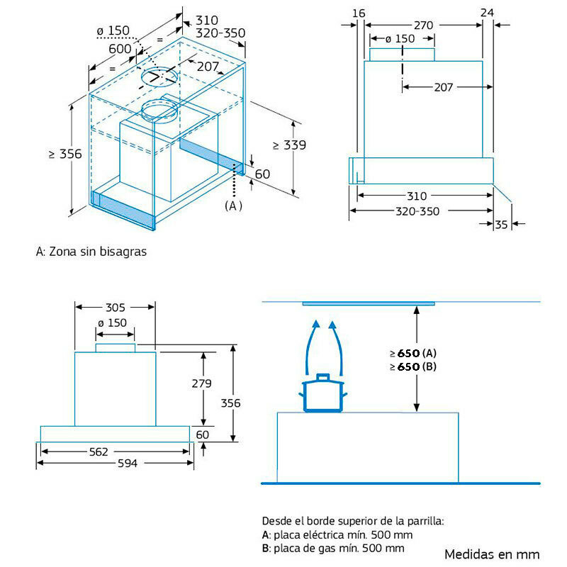 Campana integrable 60 cm Balay 3BD866MX – Bajo mueble, 620 m³/h, Clase A