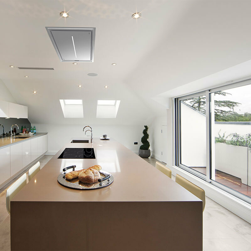 Campana de techo para instalación tipo isla en acabado acero inoxidable que combina elevada capacidad de extracción con funcionamiento mixto (evacuación o recirculación). Incorpora control táctil y mando a distancia, función turbo, iluminación LED regulable ECOLED y filtros metálicos lavables, facilitando un rendimiento eficiente y fácil mantenimiento.