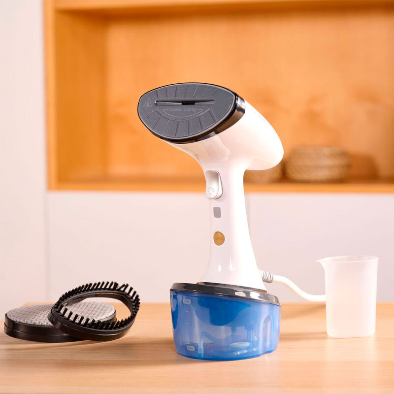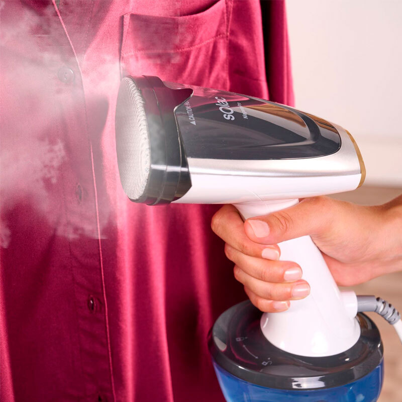 Plancha vertical Solac PC1503 Niagara Pro diseñada para eliminar arrugas y desinfectar prendas de forma rápida y práctica. Ofrece 1680 W de potencia, vapor continuo de 40 g/min y depósito de 0,20 L para sesiones prolongadas. Su suela cerámica garantiza deslizamiento suave y viene con accesorios para pelusas y prendas delicadas, calentamiento en 25 s y cable de 2 m.