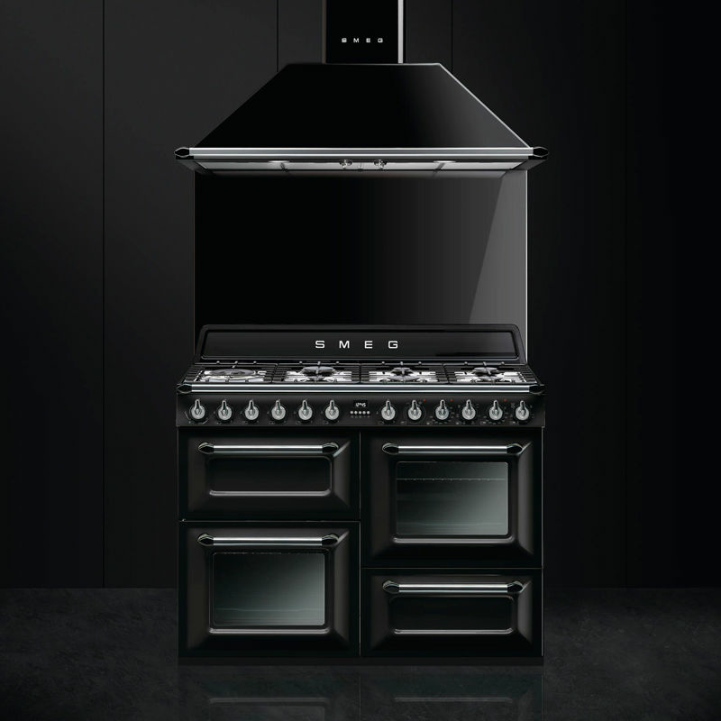 Cocina independiente Smeg TR4110BL1 de 110 cm con placa de gas de siete quemadores y tres hornos eléctricos multifunción. Ofrece cavidades de 61 L y 36 L, limpieza Vapor Clean, encendido automático, válvulas de seguridad y acabado esmaltado en color negro, diseñada para alto rendimiento y uso intensivo.