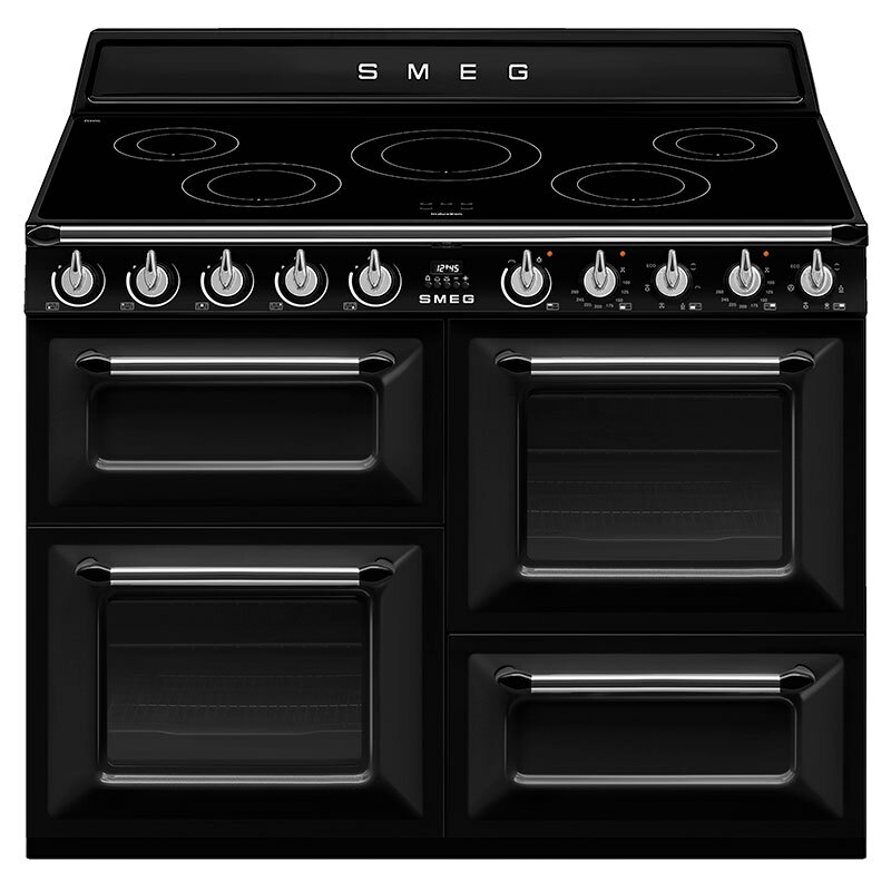 Cocina Smeg TR4110IBL2 de 110 cm con placa de inducción y dos hornos eléctricos diseñada en estética Victoria. Ofrece cinco zonas de cocción, función Vapor Clean para limpieza asistida, termoventilación multifunción y amplia capacidad de horno. Destaca por su control preciso, elevada potencia y sistema de refrigeración tangencial que mejora la seguridad y eficiencia energética.