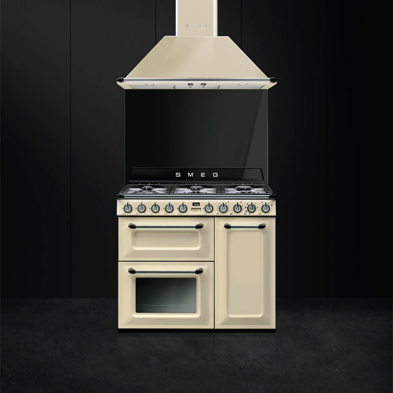 Cocina Smeg TR93P de 90 cm con estética Victoria que integra placa a gas de seis quemadores y tres hornos eléctricos multifunción. Ofrece horno principal de 61 L con convección verdadera, encendido desde los mandos y válvulas de seguridad, sistema Vapor Clean para limpieza fácil y acabados esmaltados de alta resistencia.