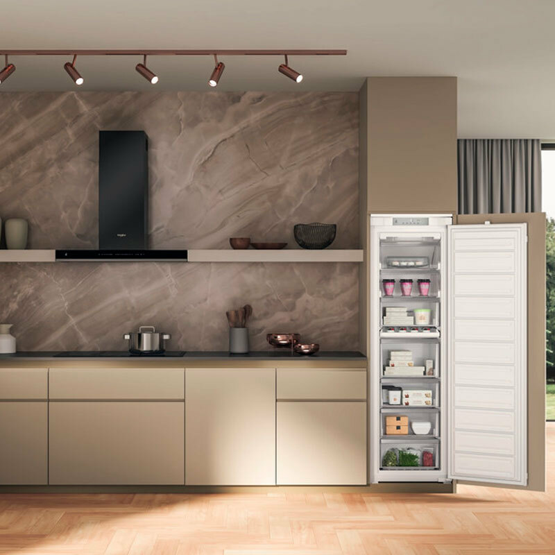 Congelador integrable vertical Whirlpool WHSD18F073C1 de 209 litros con sistema No Frost y clasificación energética E. Diseñado para integración en mobiliario, incorpora display electrónico interior, función de congelación rápida, compresor eficiente y puerta reversible para una conservación fiable y manejo cómodo.