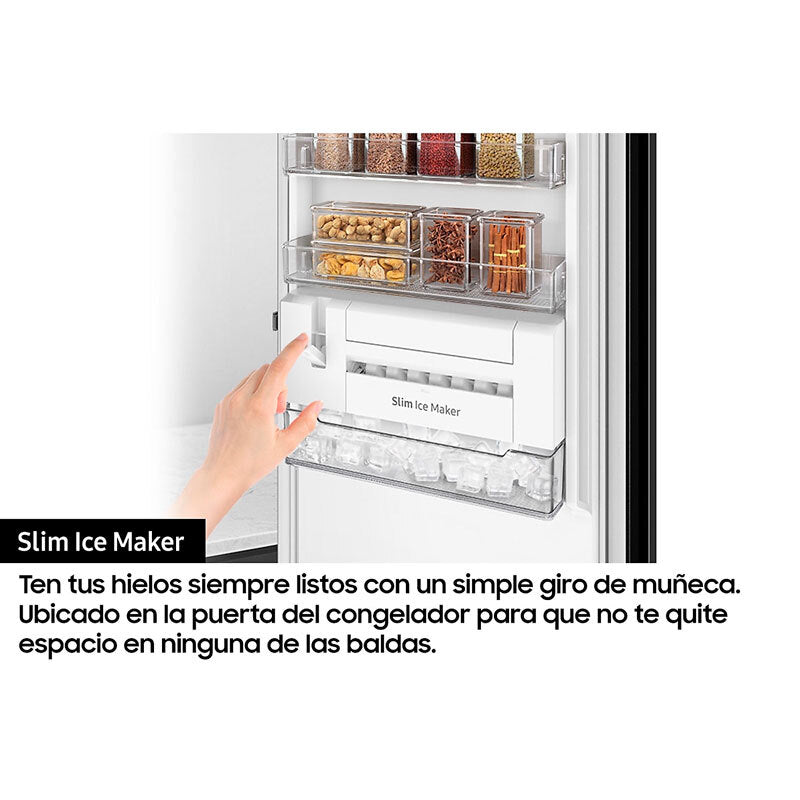 Congelador vertical Samsung BESPOKE RZ32A748522/EF en acabado negro diseñado para uso independiente. Ofrece 323 L de capacidad, sistema No Frost y modo convertible para transformar la cavidad según necesidad. Incluye Slim Ice Maker, display interno y compresor Digital Inverter para mayor eficiencia y durabilidad.