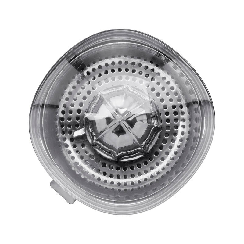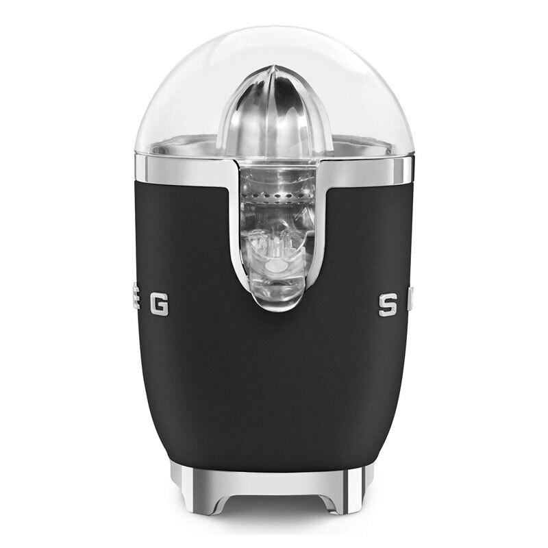 Exprimidor eléctrico Smeg CJF01BLMEU en acabado Negro Mate que combina diseño 50's y materiales premium. Motor de 70 W con arranque por presión, cono universal y filtro de acero inoxidable, boquilla antigoteo y bol de Tritan reciclado. Piezas desmontables aptas para lavavajillas y base antideslizante.