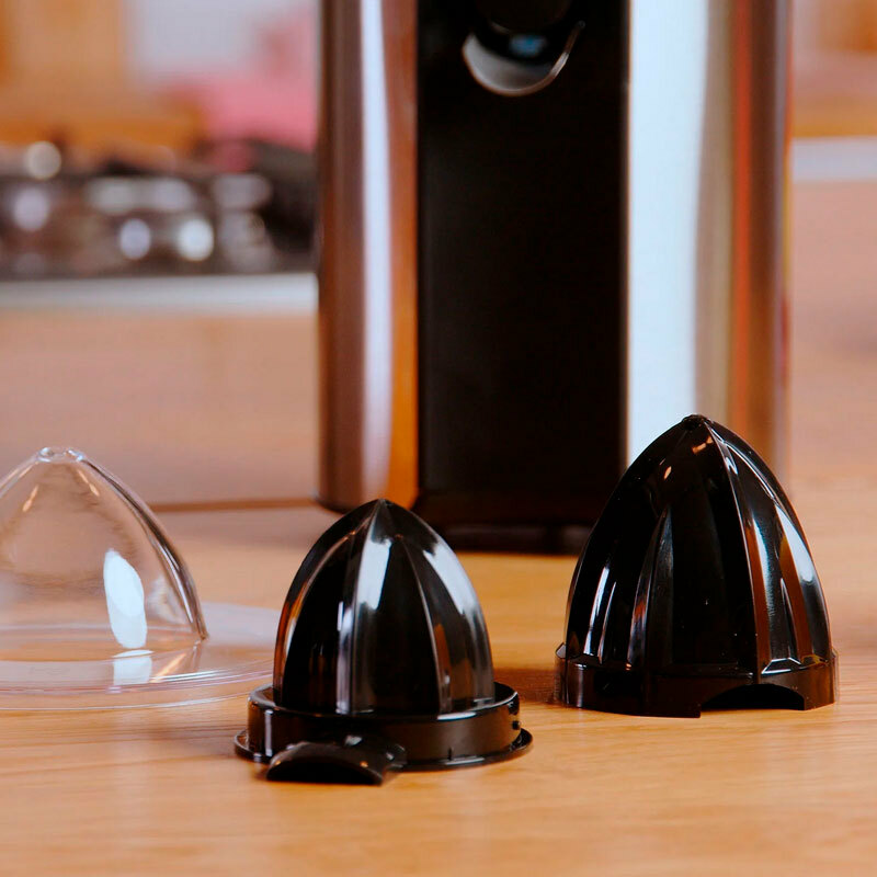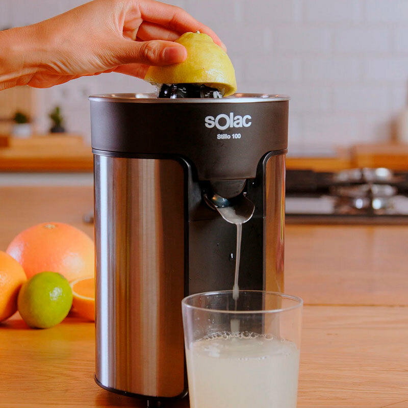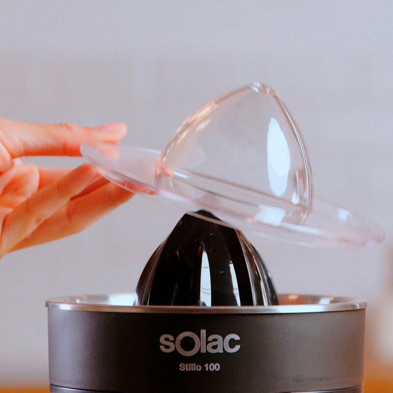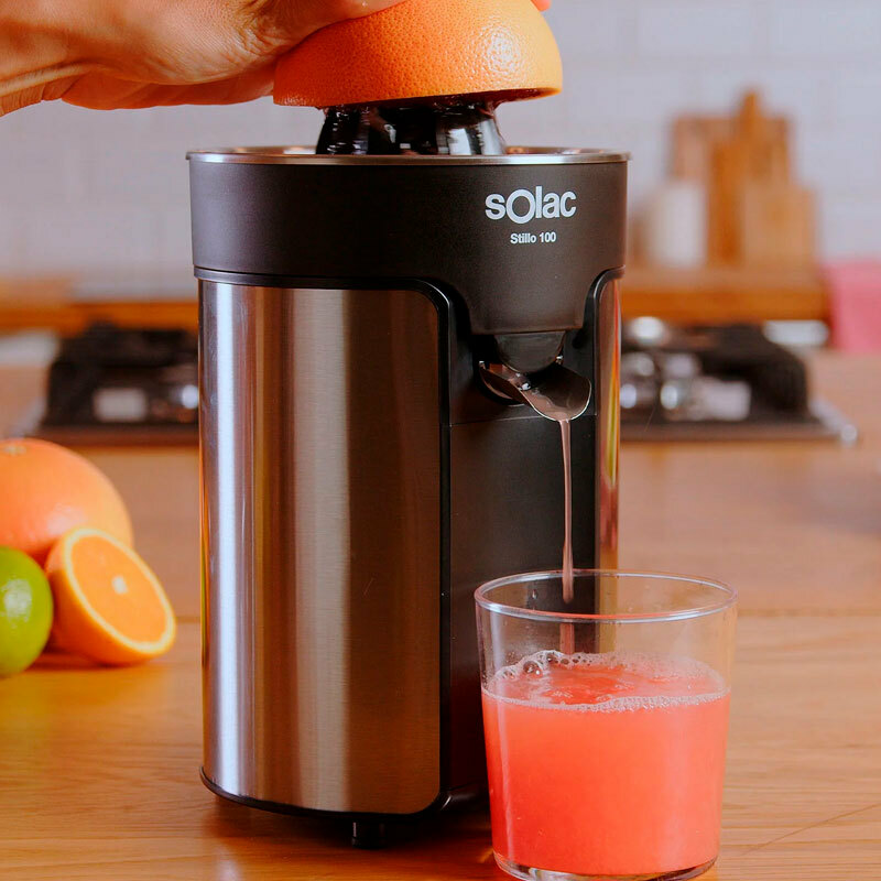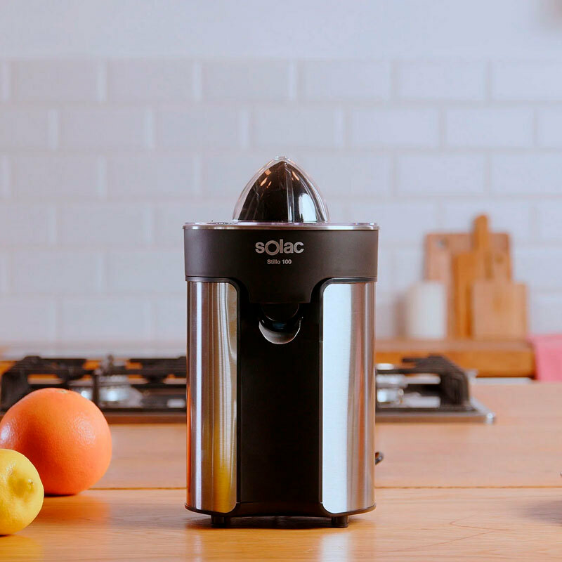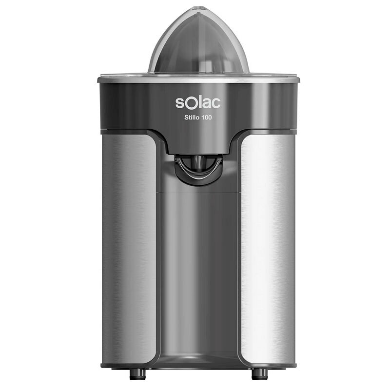 Exprimidor eléctrico Solac Stillo 100 de 100 W diseñado para extracción rápida y limpia de cítricos. Cuerpo, filtro y boca en acero inoxidable, dos conos desmontables y sistema antigoteo que permite servir directamente al vaso. Piezas aptas para lavavajillas y base antideslizante.
