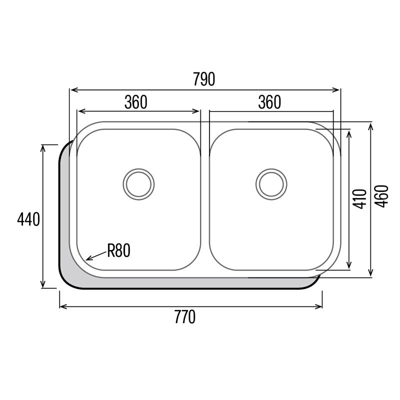 Fregadero Cata CB-2 de instalación bajo encimera fabricado en acero inoxidable AISI 304 con espesor de 0,9 mm. Presenta dos cubetas cuadradas de 20,0 cm de profundidad y medidas exteriores de 79,0 x 46,0 cm. Diseño sin escurridor y rebosadero integrado que facilita la limpieza y garantiza durabilidad.