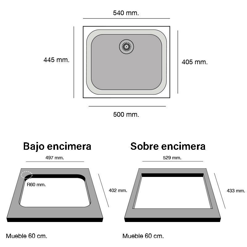 Fregadero Poalgi Gandia 50 en acabado negro liso brillo diseñado para uso doméstico. Fabricado en composite Roc-Stone con tratamiento antibacteriano, ofrece alta resistencia a impactos y temperaturas, fácil mantenimiento y buena durabilidad. Dimensiones compactas y montaje versátil para mueble de 60 cm, incluye válvula, sifón y accesorios de instalación.