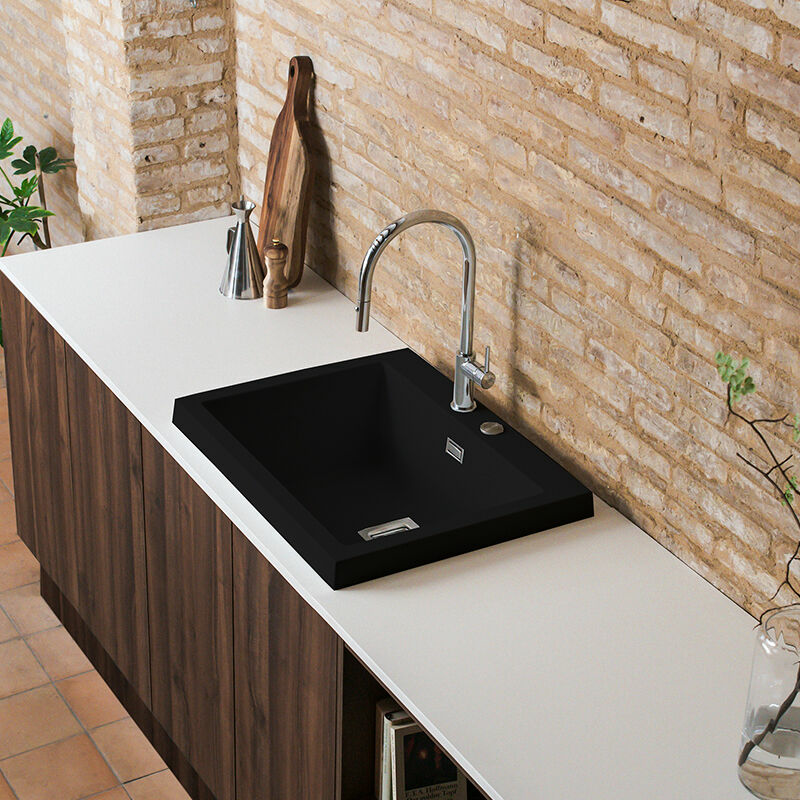 Fregadero 1 cubeta Poalgi Kobus 822 Alto – Sobre encimera, Cubeta 22,5 cm, Acabado Basalt negro