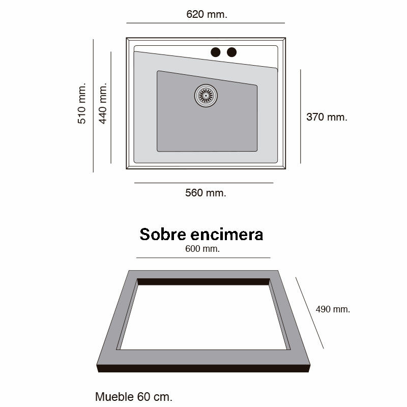 Fregadero 1 seno Poalgi Kuma 301 – Resina negro brillo, Sobre encimera, Cubeta 22 cm