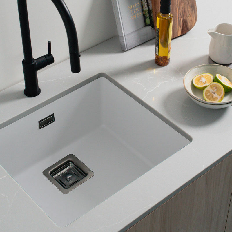 Fregadero Poalgi Zie 45 1/S Blanco diseñado para instalación bajo encimera que combina estética minimalista y alta resistencia. Fabricado en Roc Stone a base de resinas y cargas minerales con acabado pulido brillante y tratamiento antibacteriano. Incluye válvula, sifón y accesorios para montaje, ofrece una cubeta profunda de fácil limpieza y buena resistencia a golpes y rayados, apto para mobiliario estándar de cocina.