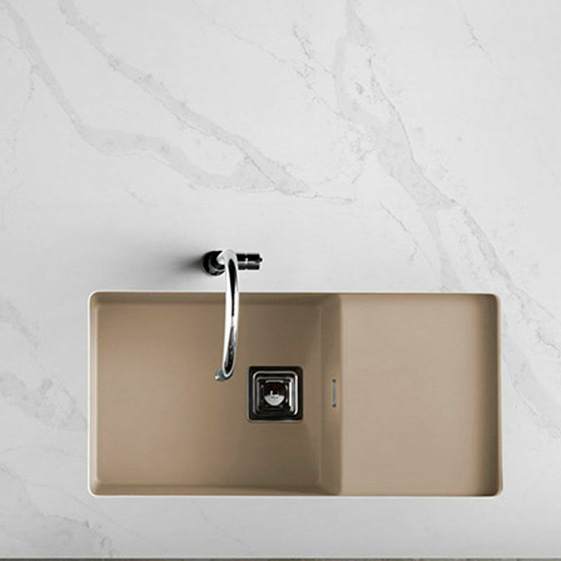 Fregadero de diseño minimalista fabricado en Roc Stone®, un compuesto de resinas y cargas minerales que aporta alta resistencia a golpes, rayados y temperatura. Un seno con escurridor reversible acabado brillo y superficie antibacteriana para fácil limpieza. Apto para mueble 90 cm e incluye válvula, sifón, sellante y barra de anclaje; garantía 5 años.