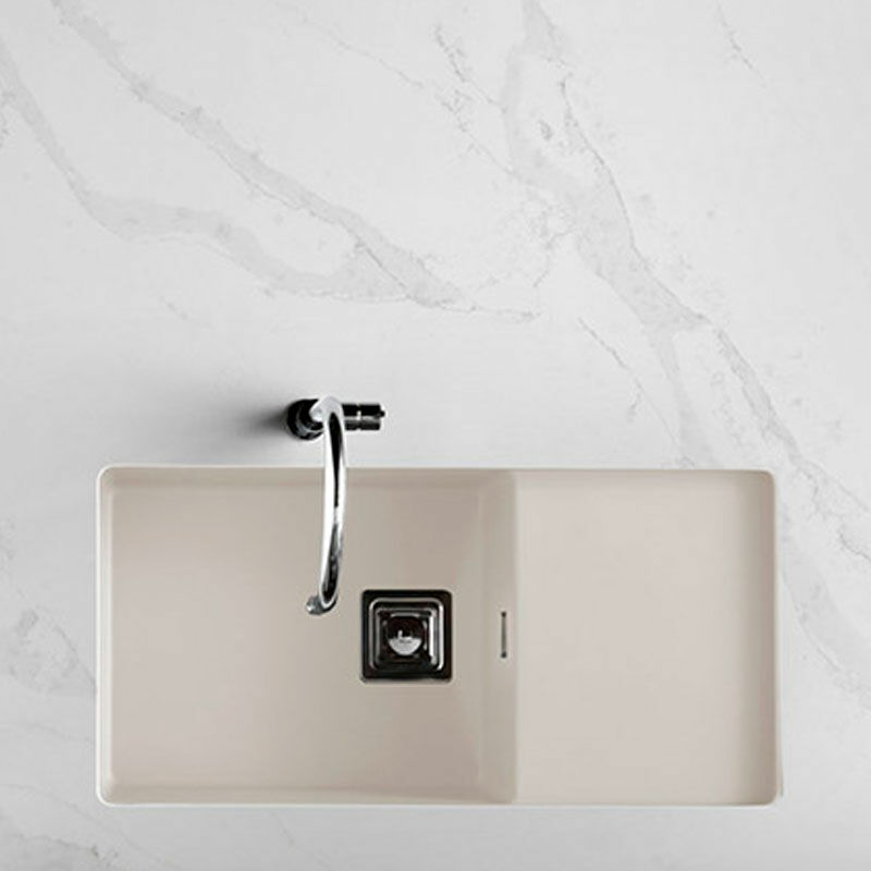 Fregadero Poalgi Zie 81 1/S+E en resina Roc Stone color Pergamon con acabado brillo. Diseño rectangular de una cubeta con escurridor reversible apto para instalación sobre o bajo encimera en mueble desde 90 cm. Medidas 85×45 cm y cubeta de 20 cm de profundidad para gran capacidad. Superficie antibacteriana Bactiblock y accesorios incluidos para instalación y mantenimiento.