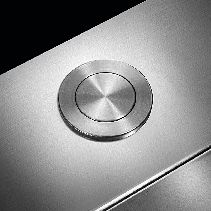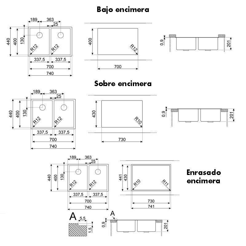 Fregadero Smeg en acero inoxidable AISI 304 con acabado cepillado y doble cubeta que proporciona resistencia, higiene y fácil mantenimiento. Ancho 74 cm y cubetas de 340x400x200 mm con rebosadero alineado. Marco ultrafino de 1 mm permite instalación filotop, sobre o bajo encimera. Incluye kit de desagüe integrado, sifón con conexión para lavavajillas, ganchos de montaje y silicona.