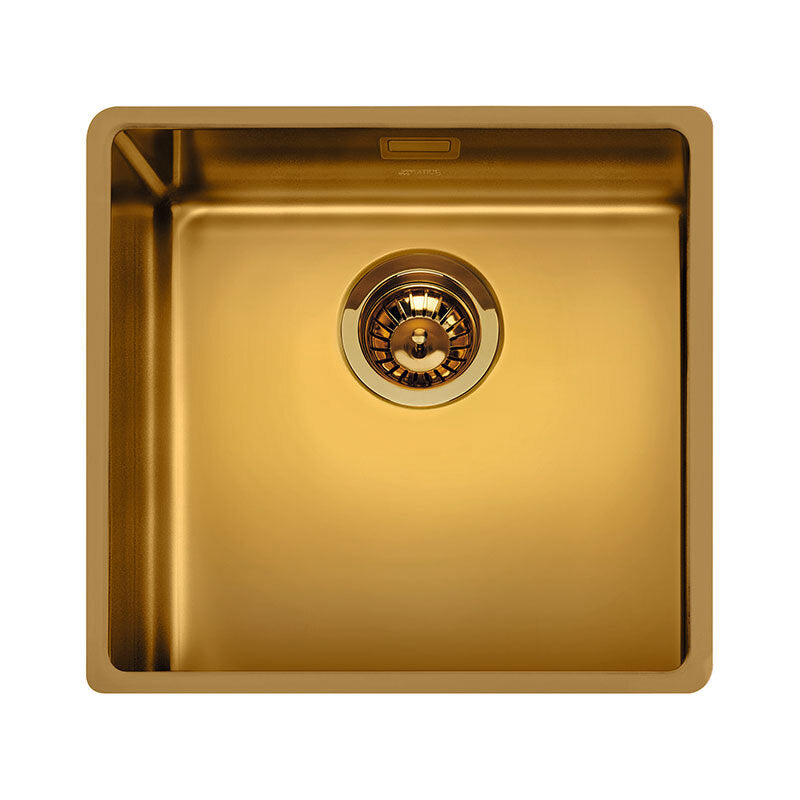 Fregadero Smeg VSTR71BRX con acabado PVD bronce cepillado que ofrece alta resistencia y apariencia refinada. Fabricado en acero inoxidable AISI 304 de 1,0 mm, monobloque de una cubeta de 71 cm y 20 cm de profundidad. Instalación bajo encimera con rebosadero integrado y desagüe 3,5".