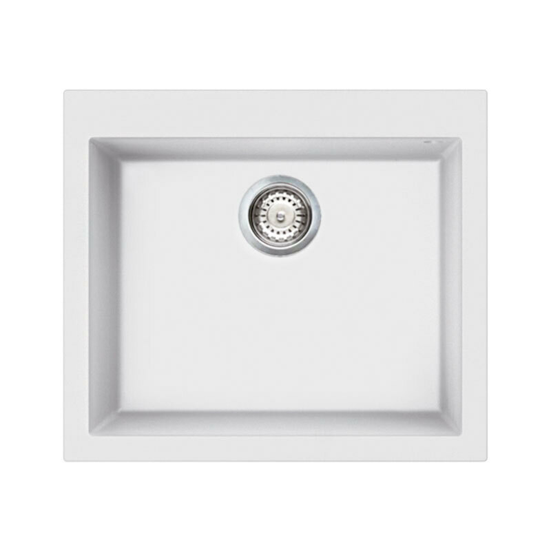 Fregadero Smeg VZ57B blanco de una cubeta, fabricado en composite de granito y resina con acabado texturizado que reproduce la piedra natural. Diseñado para instalación sobre encimera con hueco 550 x 480 mm y mueble mínimo 60 cm. Cubeta 500 x 400 x 210 mm, orificio grifo 35 mm, rebosadero tradicional. Antibacteriano y resistente a altas temperaturas, choques térmicos, impactos y arañazos. Incluye sifón con conexión para lavavajillas, ganchos y junta para montaje.