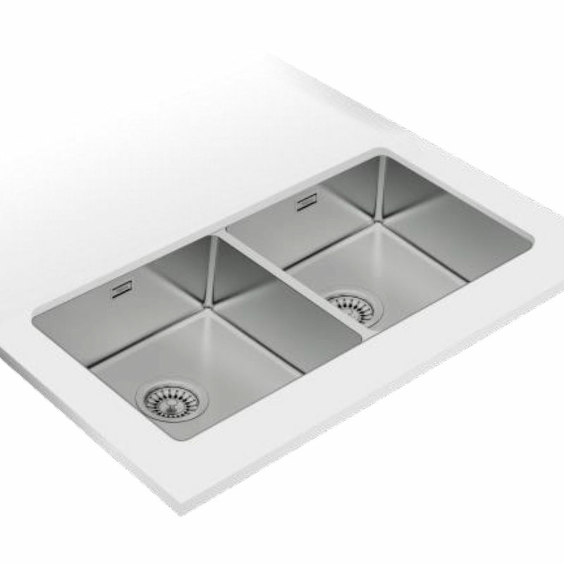 Fregadero de dos cubetas Teka BE Linea RS15 2C 860 diseñado para instalación bajo encimera. Fabricado en acero inoxidable 18/10 con radio R15 y cubetas de 20 cm de profundidad que ofrecen gran capacidad y limpieza sencilla. Incluye SilentSmart para reducción de ruido y válvula canasta 3 1/2" con sifón.