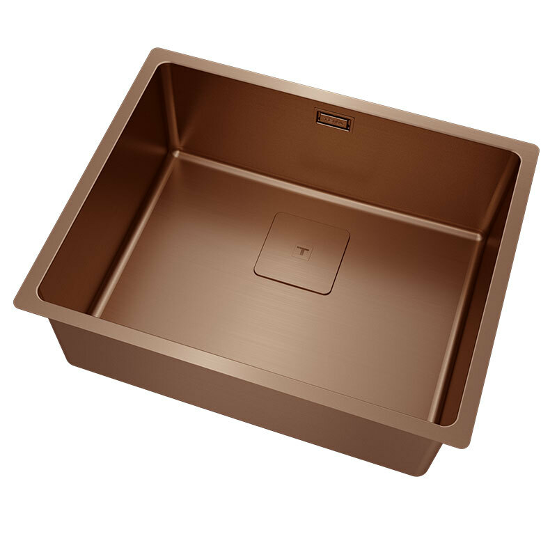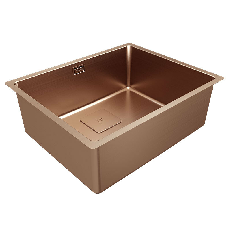 Fregadero Teka FlexLinea RS15 50.40 en acabado cobre PVD de una cubeta y diseño rectangular. Permite instalación encastrada, enrasada o bajo encimera. Fabricado en acero inoxidable 18/10 con grosor de 1,0 mm y cubeta de 200 mm de profundidad. Incluye válvula cesta 3 1/2" y sifón, tapa decorativa y sistema SilentSmart de reducción acústica.