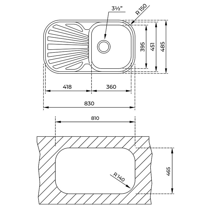 Fregadero encastrado Stylo 1C 1E de Teka en acero inoxidable 18/10 reversible, diseñado para muebles de 45 cm. Incluye una cubeta de 36 cm y escurridor reversible, profundidad de cubeta 17 cm y válvula canasta 3½". Ofrece resistencia, fácil limpieza e instalación precisa.