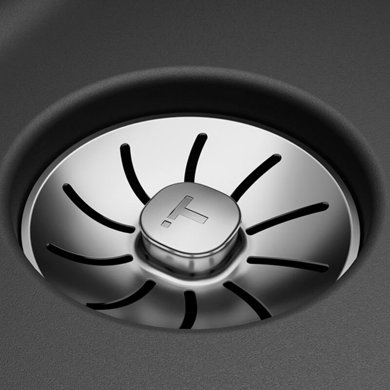 Fregadero Tegranite+ Teka Radea R10 50.40 M-TG en acabado negro que combina alta resistencia y funcionalidad. Fabricado con aproximadamente 80% de cuarzo y resinas acrílicas ofrece resistencia a impactos, arañazos, choques térmicos y decoloración. Una cubeta XXL de 500x400x200 mm, instalación 2‑en‑1 (encastre o bajo encimera), válvula canasta 3½" PerfectFlow, cesta HelixPro y accesorios de instalación que facilitan la limpieza y el uso diario.