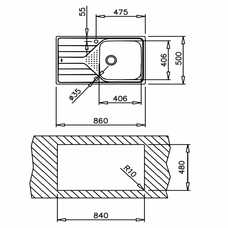 Fregadero Teka Universe 50 T-XP 1C 1E PLUS reversible fabricado en acero inoxidable con acabado pulido. Cuenta con una cubeta profunda, escurridor reversible y sistema de desagüe con válvula canasta 3½" y sifón. Diseñado para encastre en mueble de 50,0 cm, ofrece durabilidad y fácil mantenimiento.