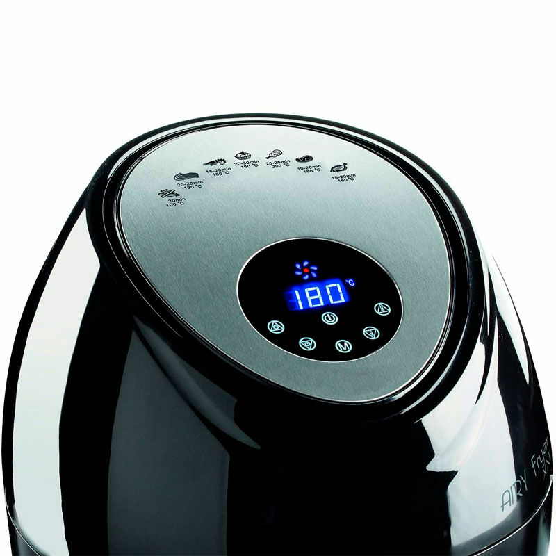 Freidora de aire Ariete Saludable XXL diseñada para familias numerosas. Ofrece una cesta XXL de 5,5 L y capacidad de fritura hasta 2,5 kg, control táctil con pantalla LCD, 7 programas automáticos y rango de temperatura 80-200 ºC. Potencia de 1.800 W para cocción rápida y uniforme con mínima grasa, partes extraíbles y revestimiento antiadherente para limpieza sencilla.