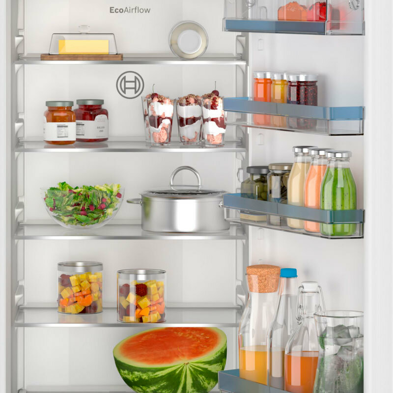 Frigorífico integrable de una puerta Bosch KIR41VFE0 Serie 4 con 204 L de capacidad útil y tecnología EcoAirflow para mantener temperatura constante. Iluminación LED, función Super Refrigeración, estantes regulables y cajón MultiBox para frutas y verduras. Clase energética E, consumo anual aproximado 101 kWh y bajo nivel sonoro de 35 dB, diseñado para integración en mobiliario.